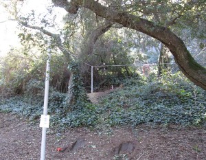 On a beautiful Saturday afternoon a large group of Piedmont and Oakland residents gathered to rally under the flowering trees along Moraga Avenue in Moraga Canyon and view the proposed location of the proposed sports complex called Blair Park. Those present found themselves in the midst of an area where no houses are visible because of screening by numerous mature trees. Many present at the rally chanted and waved signs at passing cars, while others viewed the recently installed story poles.